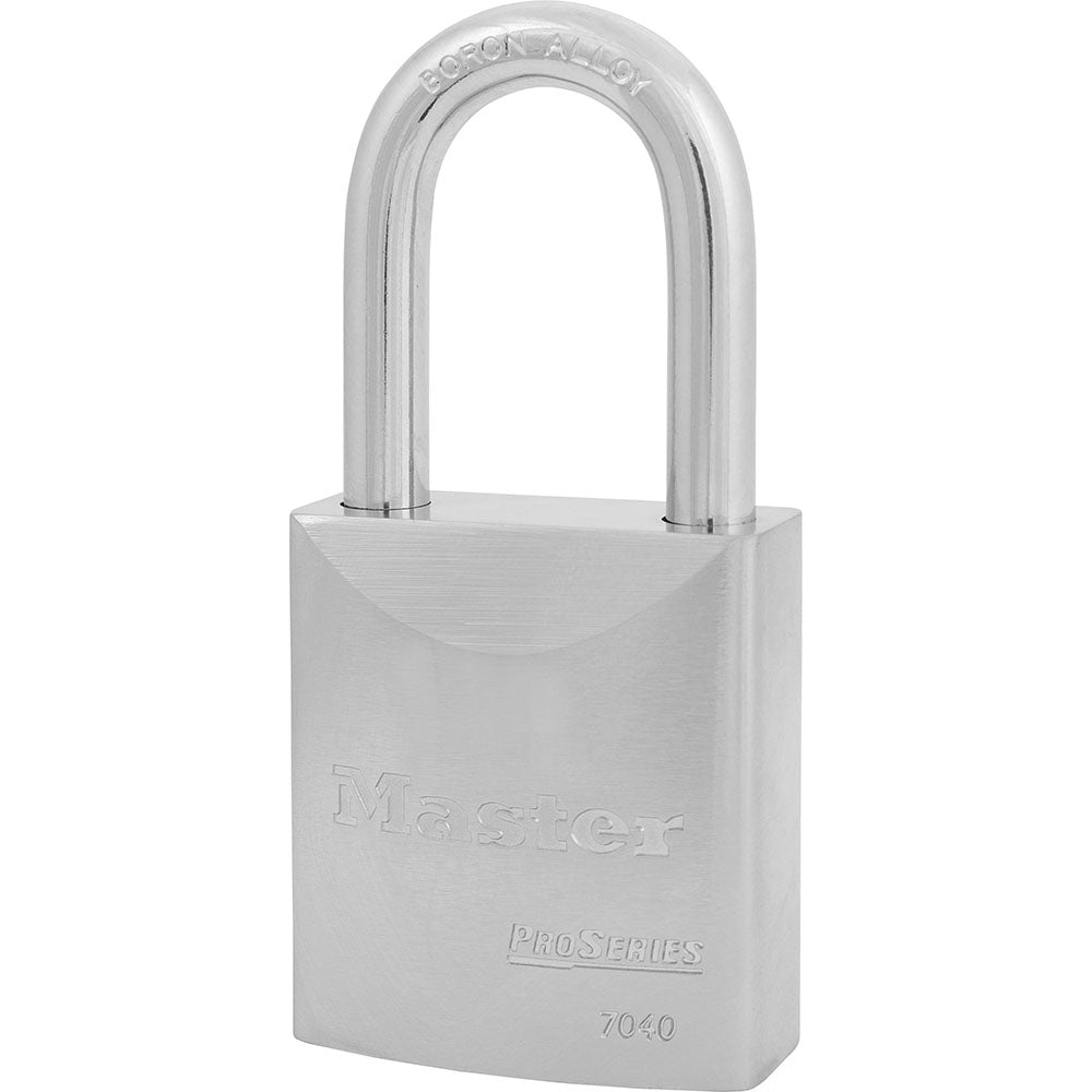 The Master Lock No. 7040KA ProSeries® Solid Body Padlock, keyed alike – multiple locks open with the same key – features a 1-3/4in (44mm) heavy hardened steel body with chrome rustproofing and a 1-3/16in (30mm) tall, 5/16in (8mm) diameter hardened boron alloy shackle for superior cut resistance. Designed for commercial/industrial applications a dual ball locking mechanism resists pulling and prying and a high security, rekeyable 5-pin cylinder with spool pins is virtually impossible to pick.