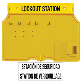 4-Lock Padlock Station, unfilled. Add safety padlocks of your choice. Includes translucent, lockable cover to protect contents from dust and debris. Trilingual labels provided for optional application. Station measures 12-1/4in high x 16in wide x 1-3/4in deep (311mm x 406mm x 44mm).