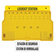 10-Lock Padlock Station, unfilled. Add safety padlocks of your choice. Includes translucent, lockable cover to protect contents from dust and debris. Trilingual labels provided for optional application. Station measures 15-1/2in high x 22in wide x 1-3/4in deep (393 mm x 558mm x 44mm).