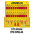 Spanish/English 20-Lock Padlock Station with Cover. Includes Twenty A1106RED Aluminum Padlocks (Keyed Different), 4 Hasps, 48 Spanish/English Tags.