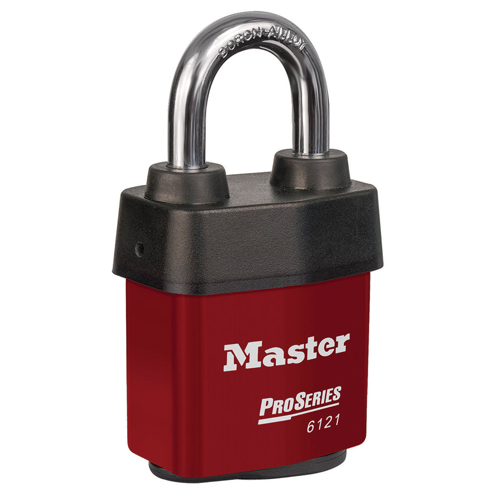 The Master Lock No. 6121KA ProSeries® Weather Tough® Covered Laminated Padlock, Keyed Alike – multiple locks open with the same key – features a 2-1/8in (54mm) wide heavy steel body to withstand physical attack and a 1-1/8in (29mm) tall, 5/16in (8mm) diameter hardened boron alloy shackle for superior cut resistance. The exclusive cover protects this padlock from harsh elements & a high security, rekeyable 5-pin cylinder with spool pins is virtually impossible to pick.