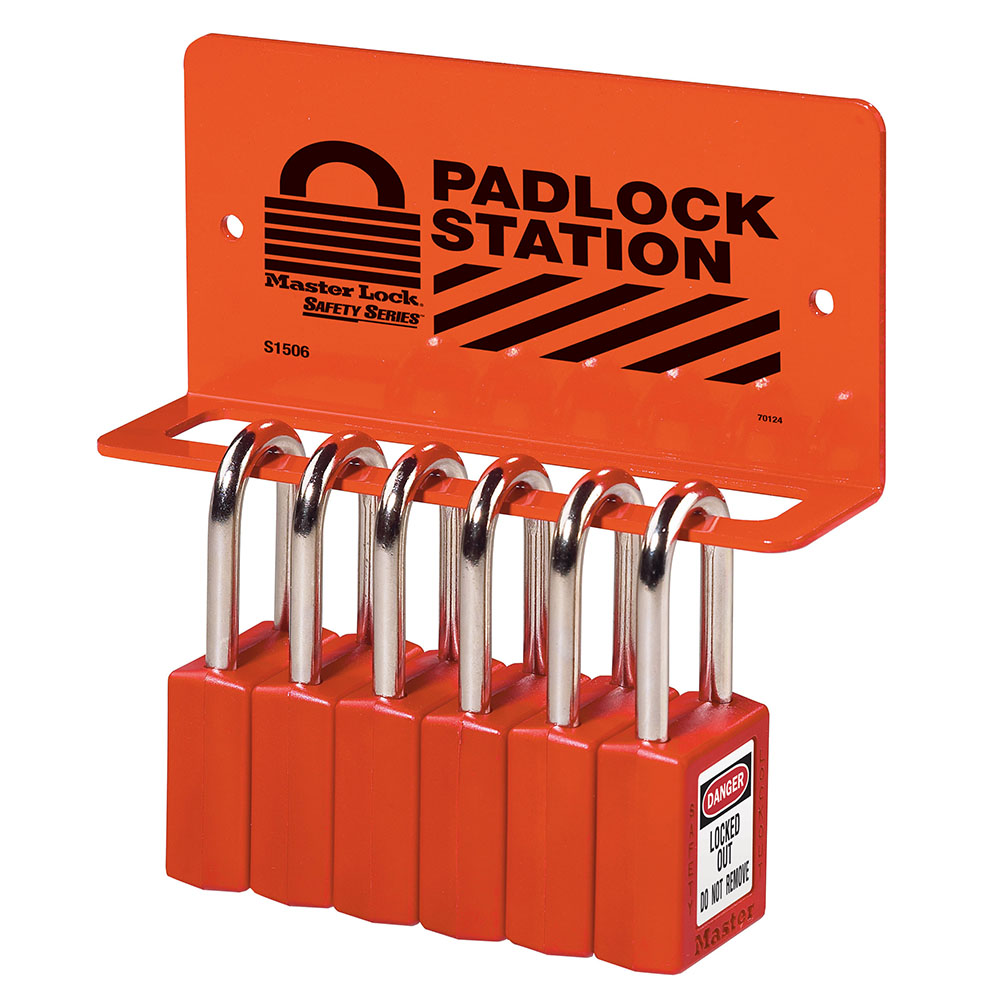 The Master Lock No. S1506 Heavy Duty Padlock rack features heavy gauge steel with durable powder coat finish to ensure long life in manufacturing facilities and the 6.25in (159mm) wide rack holds 6-8 padlocks. Includes labels in English, Spanish/English and French/English.